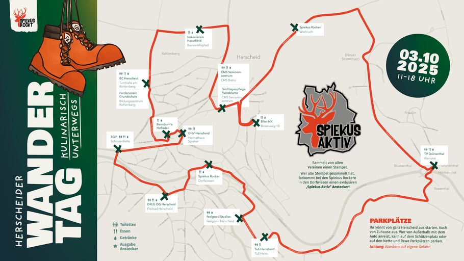 den Stationen, die Wanderkarte auf der Stempel gesammelt werden müssen und der "Spiekus aktiv - Pin" (wenn alle Stempel gesammelt wurden).